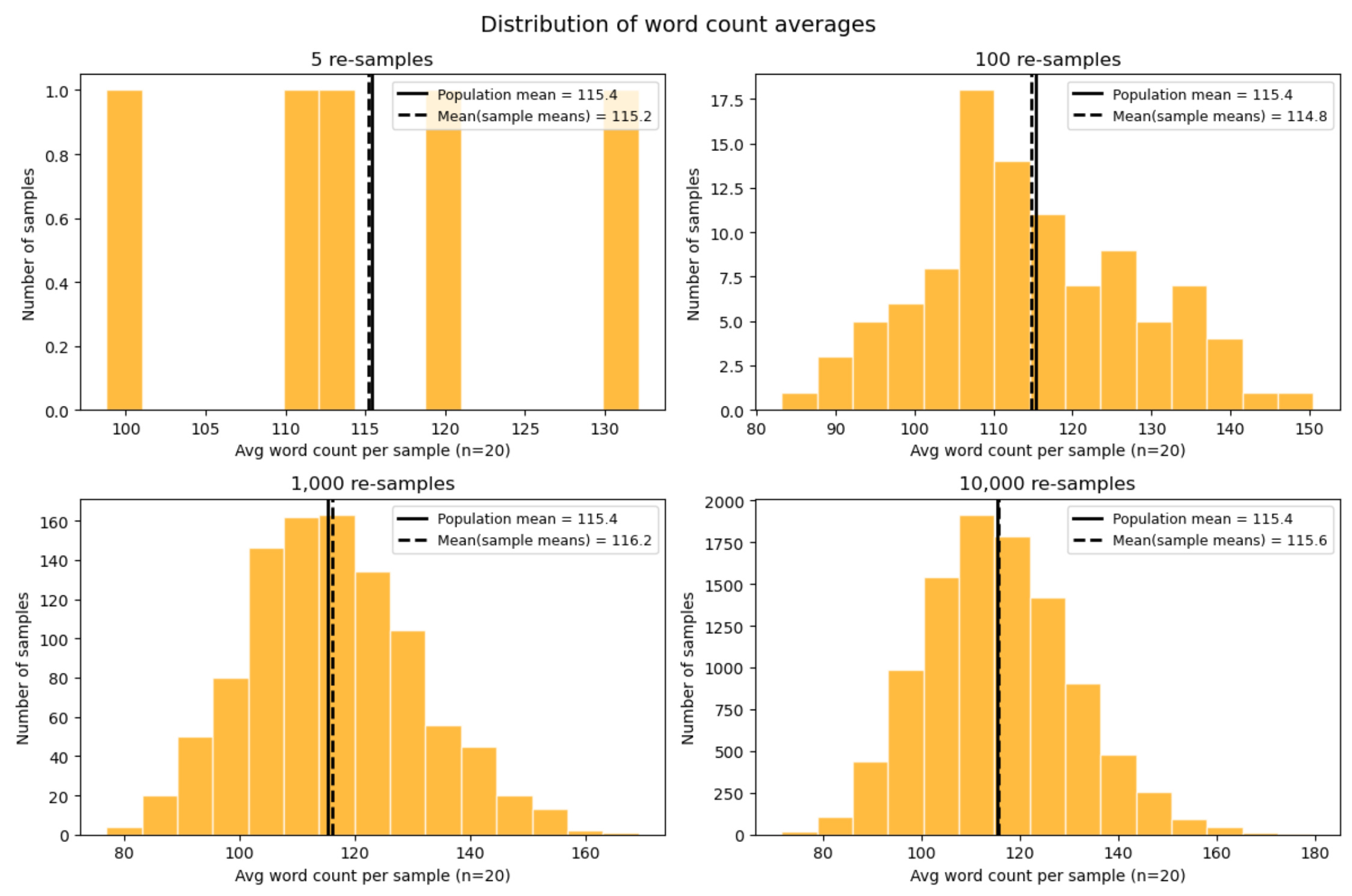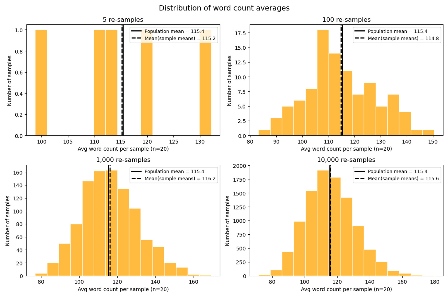 Since I have access to the whole population, calculating the true average is straightforward. I can count the words in each poem and compute the mean. This turns out to be 115.4 words, as depicted in the histogram below. Most poems sit between 50 and 150 words, with a handful of longer outliers.