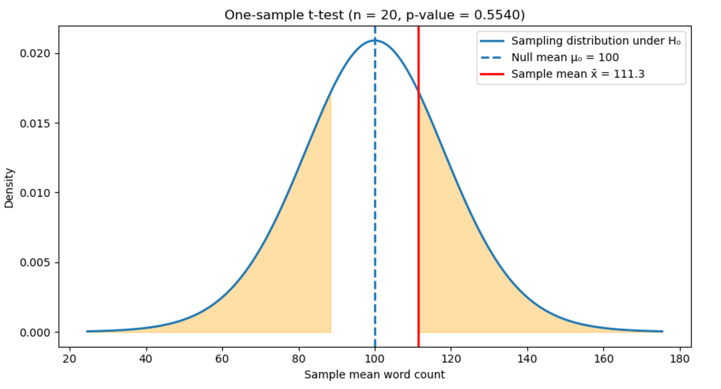 Researchers typically set a threshold beyond which they determine a result to be surprising using the approach outlined above (known as Null Hypothesis Significance Testing, or NHST). Usually this threshold is 0.05: if the p-value is less than 0.05 the “null hypothesis”—the assumption that the true average word count is 100—is rejected. My p-value here is 0.554, so I do not reject the null.